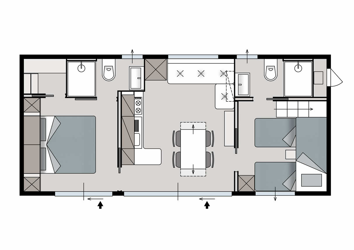 Una camera con letto matrimoniale (140X190), una con due letti separati, angolo cottura attrezzato, soggiorno e bagno (Wc, lavandino e doccia). All'esterno ogni casetta ha un terrazzino con tendalino avvolgibile parasole, con tavolo e sedie.